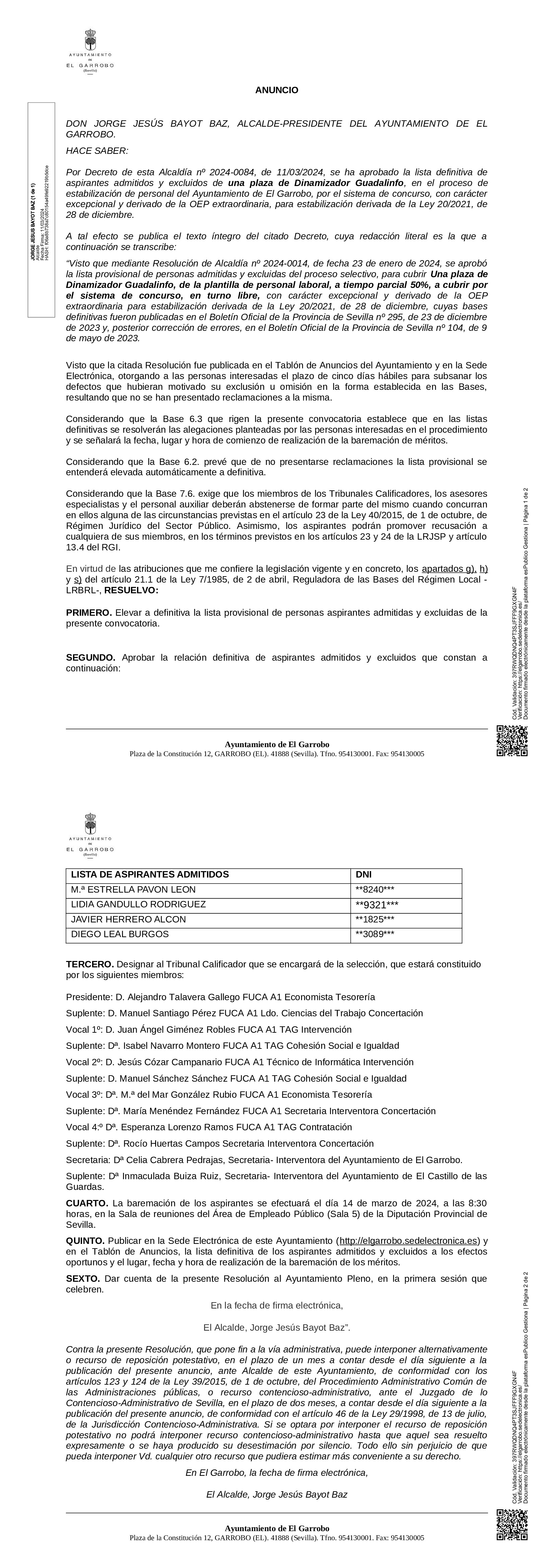 Resolución por la que se aprueba la lista definitiva de admitidos/ excluidos de una plaza de Dinamizador Guadalinfo, de la plantilla de personal laboral, a tiempo parcial 50%, por el sistema de concurso, estabilización, Ley 20/2021.