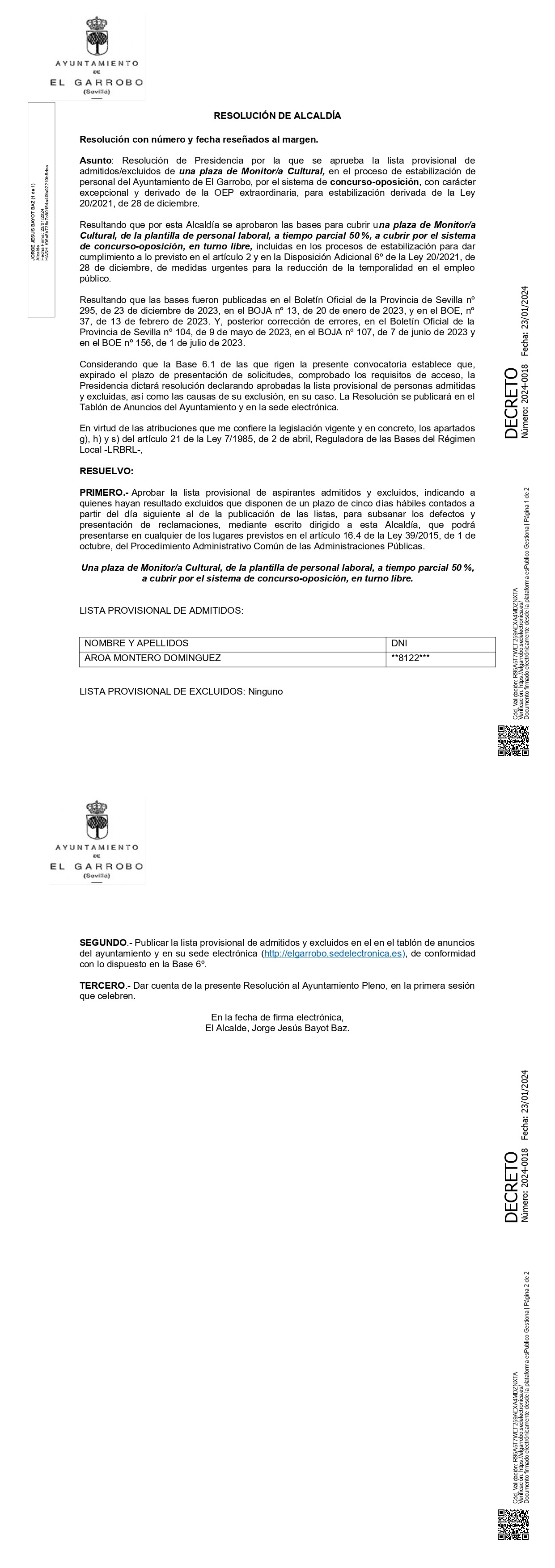Resolución por la que se aprueba la lista provisional de admitidos/ excluidos de una plaza de Monitor/a Cultural, de la plantilla de personal laboral, a tiempo parcial 50 %, por el sistema de concurso-oposición, estabilización, Ley 20/2021.