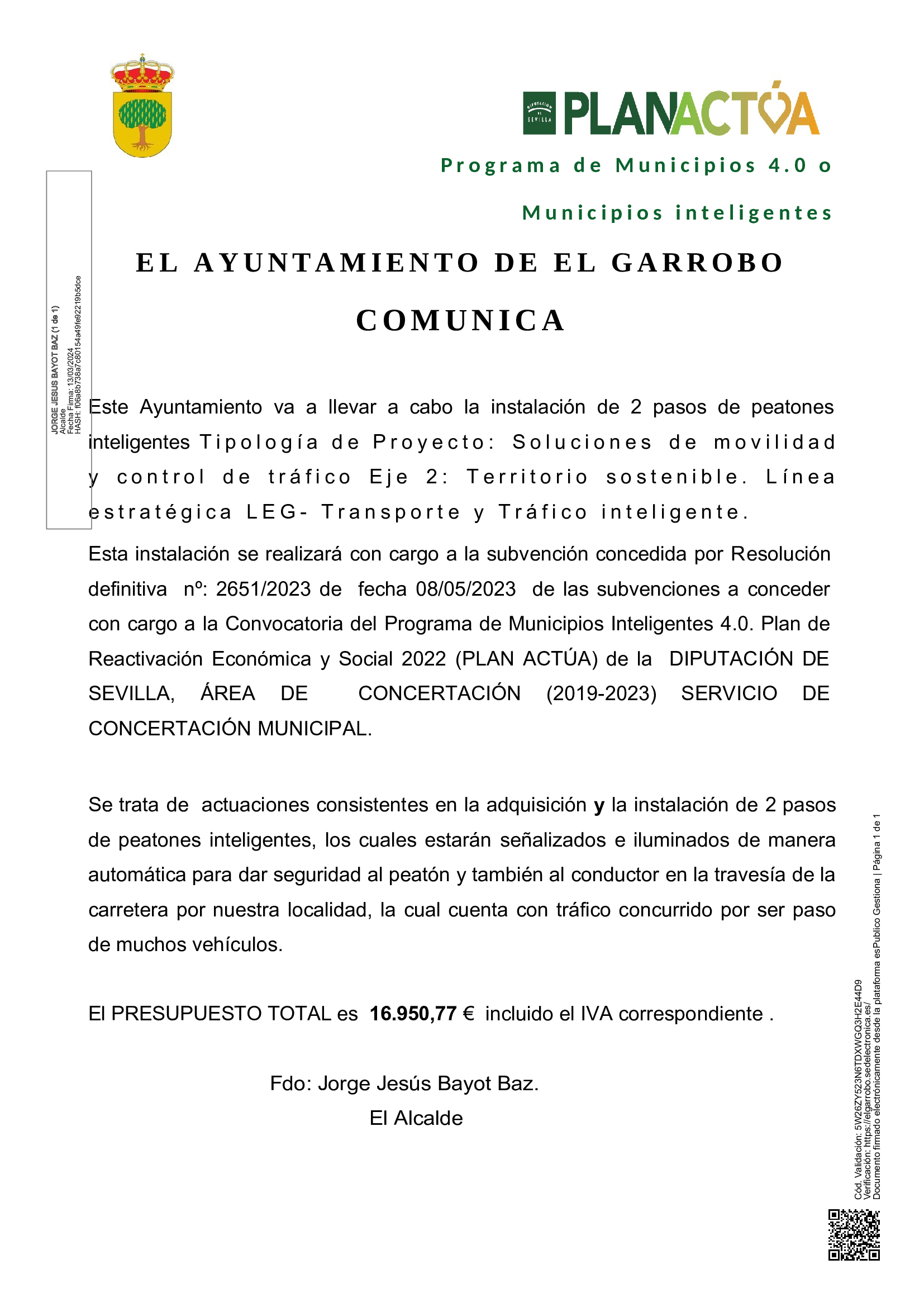 Este Ayuntamiento va a llevar a cabo la instalación de 2 pasos de peatones inteligentes Tipología de Proyecto: Soluciones de movilidad y control de tráfico Eje 2: Territorio sostenible. Línea estratégica LEG- Transporte y Tráfico inteligente.